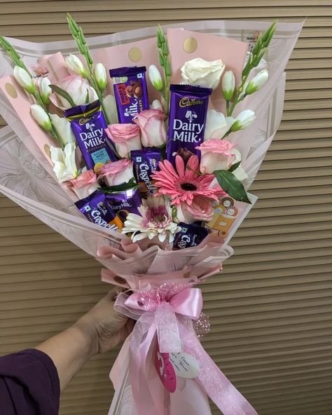 One Sided Dairy Milk bouquet with Lily and Pink Wrapping